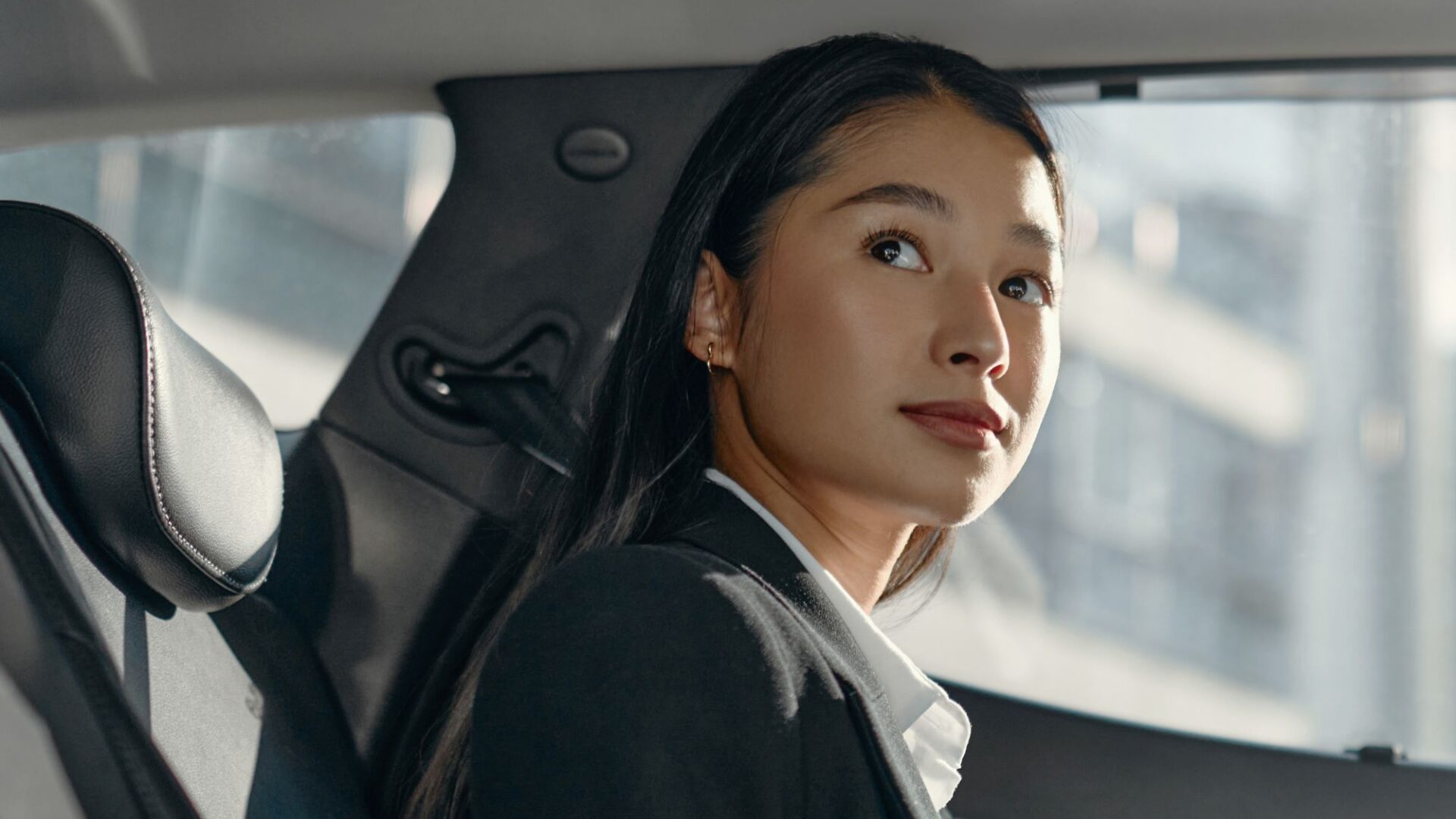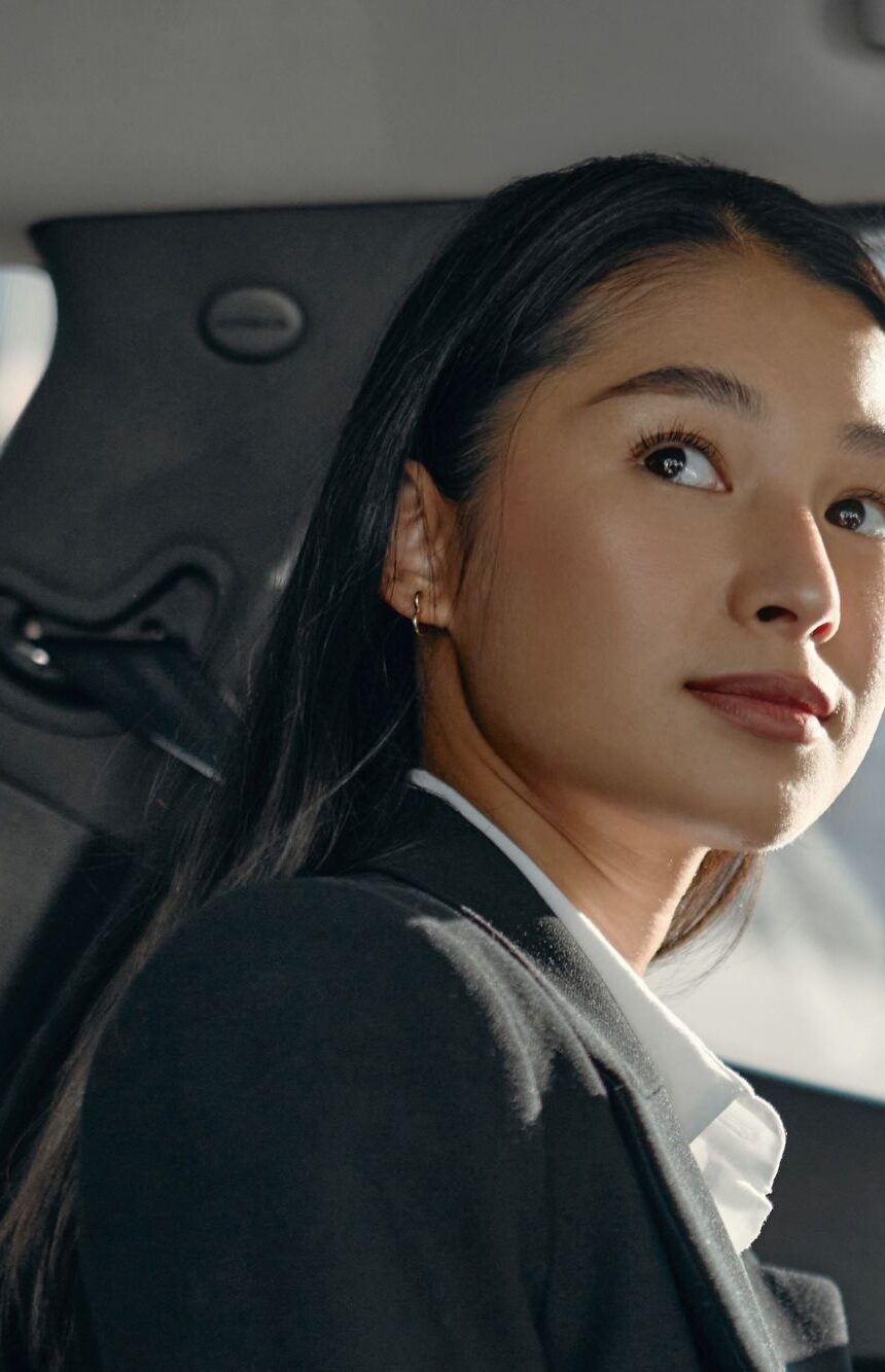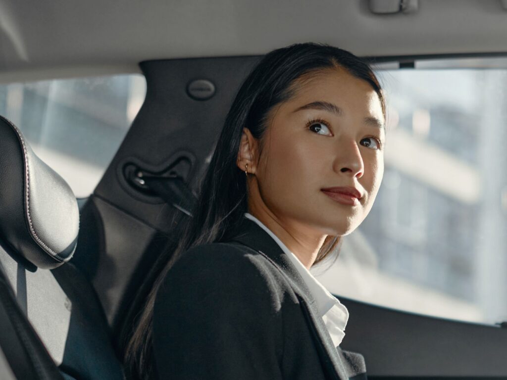 Private traveler in the backseat of a luxury car.